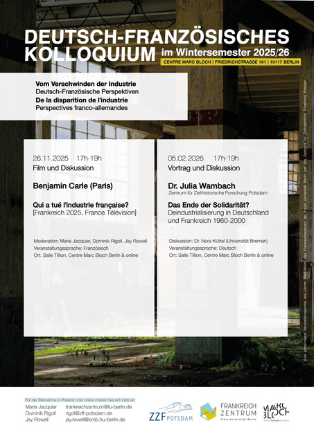 Das Deutsch-Französische Kolloquium (DfK) ist eine Veranstaltungsreihe, die gemeinsam vom Centre Marc Bloch, dem Frankreichzentrum an der Freien Universität Berlin und dem Leibniz-Zentrum für Zeithistorische Forschung Potsdam organisiert wird. Das DfK verhandelt aktuelle Themen, Projekte und Publikationen, die aus deutsch-französischer Perspektive von wissen-schaftlichem Interesse und richtet sich an Studierende und Forschende aus Berlin/Potsdam sowie eine breite (digitale) Öffentlichkeit.