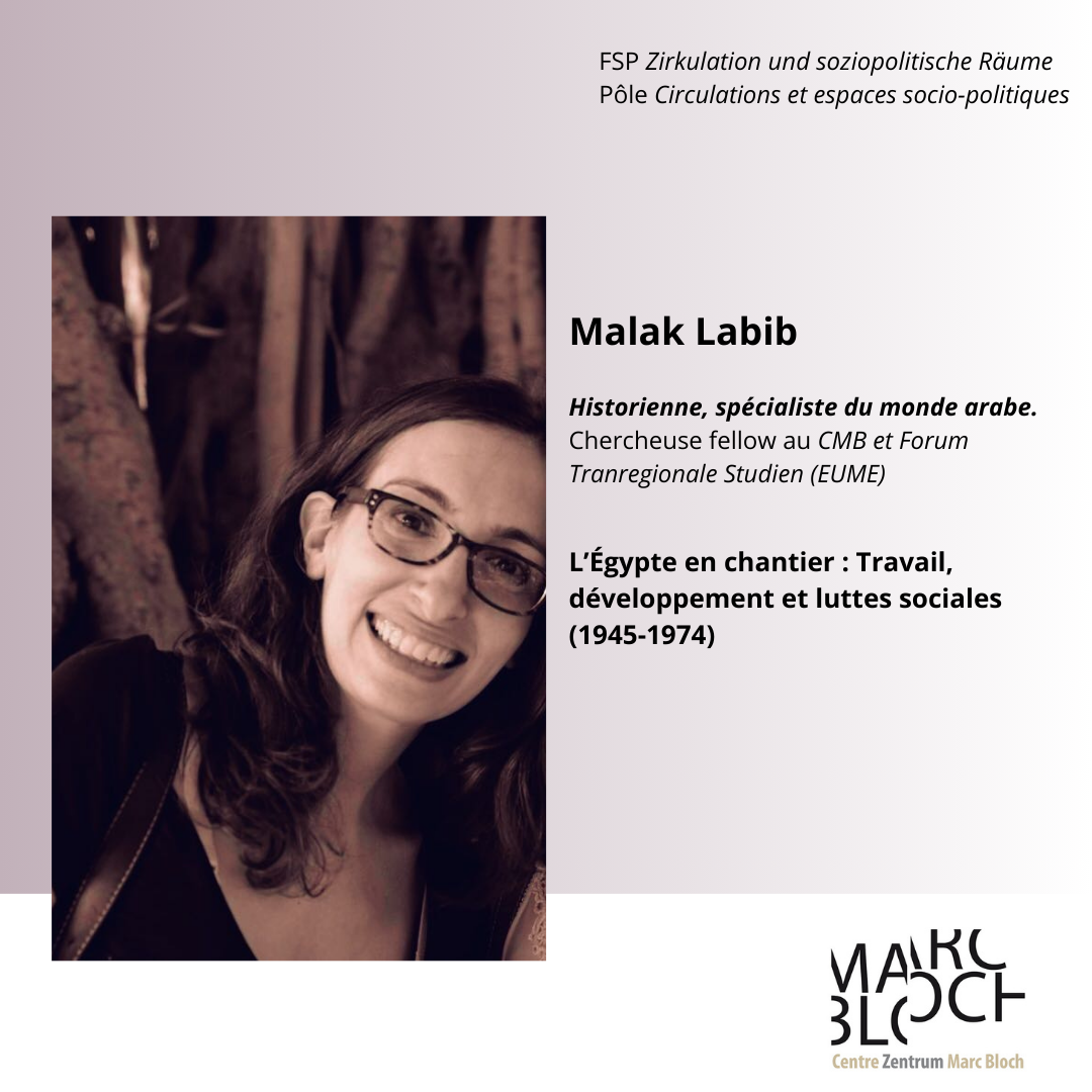 Historienne et arabisante, Malak Labib est, depuis septembre 2025, chercheuse fellow au Centre Marc Bloch et au Forum Tranregionale Studien (EUME). Elle a obtenu sa thèse en 2015 à l’Université d’Aix-Marseille et, avant son séjour au CMB, était membre scientifique à l’Institut français d’archéologie orientale au Caire. Ses recherches s’intéressent aux processus de construction de l’État, à la fabrique des savoirs et à l’histoire économique et sociale de l’Égypte aux XIXe et XXe siècles. Elle mène actuellement un projet de recherche intitulé : “Governing Labor : Developmentalism, the Welfare State and Industrialization in Egypt (1945-1974)”, financé par la fondation Gerda Henkel.