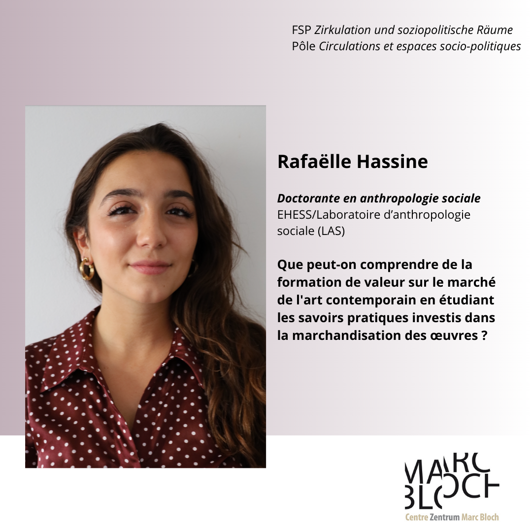 Depuis le 6 septembre 2025, Rafaëlle Hassine, doctorante à l’École des hautes études en sciences sociales (EHESS) et au Laboratoire d’anthropologie sociale (LAS), effectue un séjour d’un an au Centre Marc Bloch, grâce à une bourse de la Fondation d’études de la Chambre des députés de Berlin. Elle y poursuit la rédaction de sa thèse intitulée « Faire le marché de l’art contemporain : une ethnographie des savoirs pratiques dans une économie singulière ».