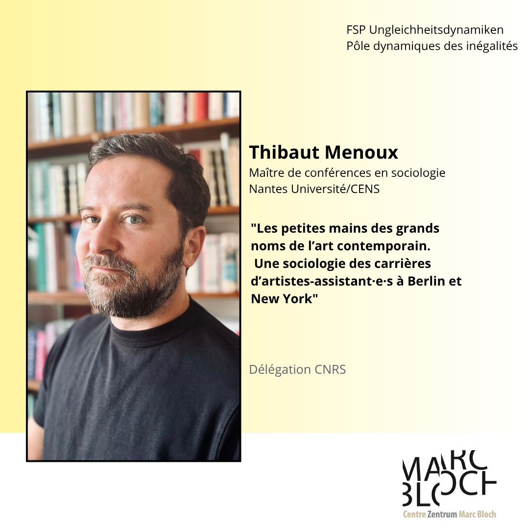 Depuis le 5 septembre 2025, Thibaut Menoux, maître de conférences en sociologie à Nantes Université et chercheur au CENS (UMR CNRS 6025), effectue un séjour d’un an au CMB dans le cadre d’une délégation CNRS. Il y poursuivra ses recherches sur le projet „Les petites mains des grands noms de l’art contemporain. Une sociologie des carrières d’artistes-assistant·e·s à Berlin et New York“ entamée en 2018 grâce à une bourse du DAAD. Ce projet interroge les formes de collaboration artistique dans la production d’œuvres d’art contemporain, en se concentrant sur les artistes qui délèguent tout ou partie de leur travail à d’autres artistes, souvent invisibilisé·e·s. Comment ces confrontations sociales entre les assistant·e·s d’artistes et les artistes renommé·e·s pour lesquel·le·s ils et elles travaillent transforment-elles les carrières, les conditions de travail et les inégalités dans le monde de l’art ? Quels sont les enjeux symboliques et économiques de cette délégation du travail artistique ? Son séjour au CMB lui permettra de poursuivre une campagne d’entretiens longitudinaux avec des artistes-assistant·e·s et d’analyser les données déjà rassemblées. Il coorganise par ailleurs avec Sarah Kiani, Nelssy Kinzonzi, Laure Piguet et Yasemin Ural le séminaire du pôle Inégalités/Ungleichheiten.